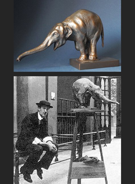 In Antwerpen kreeg Rembrandt Bugatti (1884-1916) ruim de gelegenheid om de Aziatische olifanten te bestuderen in hun spectaculaire verblijf in de vorm van een Egyptische tempel. Hij was er bijna dagelijks te vinden, en voerde er met plezier de bedelende reuzen met hun gevoelige slurf. (BUG01 – 15 cm.)
