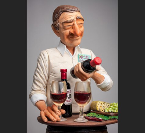 Een grote glimlach verspreid zich over zijn gezicht: Jean-François geniet van het sprankelend rood van een van de duurste wijnen in de wereld. (FO85547, The Wine Lover – h. 42 cm.)