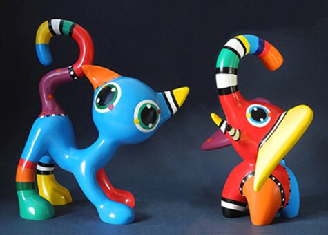 Jacky Zegers put haar inspiratie uit de natuur: dieren, planten, alle verschijningsvormen van het leven. De natuur houdt van structuur en Jacky geeft deze vormen een plek in haar werk. Daarmee wil ze mensen laten zien en voelen hoe mooi het leven is, met een knipoog. (JZ08 & JZ03 – h. 25 & 22 cm.)