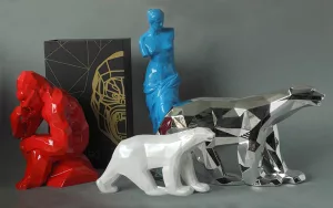 Richard Orlinski has been the biggest selling contemporary French artist in the world since 2015. He began his artistic career in 2004 and created his first work, a bright red resin crocodile, which soon became an iconic piece in the sculptor’s bestiary. The artist took inspiration from pop culture, everyday objects, popular things. Richard Orlinski soon developed new sculptures, often of animals, all symbols of freedom, power and passion. The result: electrifying works of art, in pop colours and a faceted style, that would be seen all around the world. Exhibiting his works, often of spectacular dimensions, in unusual places and the great outdoors soon became his signature. (ORL01 Polar bear Pompon mother-of-pearl colour – L. 23 cm., ORL02 Polar bear Pompon silver colour – L 36 cm., ORL03 Kong thinker red – H. 23 cm., ORL04 Venus de Milo blue – H. 36 cm.)