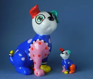 Twee wat grotere figuren uitgebracht in een gelimiteerde oplage van 300 stuks. Aan de onderzijde genummerd. Per stuk verpakt. Met het nieuw ontwikkelde patroon waarbij elk exemplaar uniek is. Om blij van te worden! Jacky zegt dan ook: ‘Het leven is er om plezier te hebben, om lief te hebben en te genieten. Hoe meer gelukkige mensen er op deze wereld zijn, hoe meer geluk er zal zijn. (JZP40 Dani – h. 30 cm. en JZP41 Duko – h. 36 cm., Ltd Ed. 300 pcs)