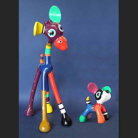 Kleurrijke kunst die je doet glimlachen. Jacky maakt kunst met maar één doel, om ons plezier en geluk te laten ervaren. (JZ19 giraffe Willem – h. 71 cm., JZ18 hond Natcho – h. 20 cm.)