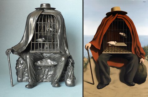 De Therapeut, 1967, weerspiegelt een aantal thema's die typisch zijn voor het werk van Magritte: het uitzonderlijke in het alledaagse, het verrassende en het onverwachte, het mysterie. Via Le Thérapeute brengt Magritte een figuur tot leven die eerder al meermaals voorkwam in zijn werk. Dit beeld is echter gebaseerd op een foto uit 1937, getiteld Dieu, le huitième jour. Voor dit specifieke beeldhouwwerk maakte hij een mal van een bestaand persoon, waarvan hij bepaalde stukken gebruikte. Ook de vogelkooi is een kopie van een echt exemplaar. (MAG07 – h. 20,5 cm.)