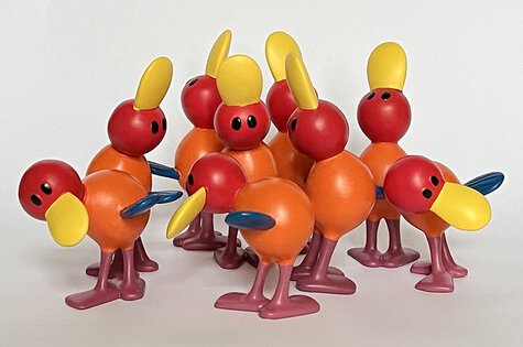 Inspiratie voor Nosybirds kwam uit het feit dat mensen in toenemende mate steeds minder oog kregen voor de dingen om hen heen. De Amsterdamse kunstenaar Jos Brölmann begon in 2010 met zeer kleurrijke schilderijen waar vaak rijen of groepjes met vogeltjes te zien waren. Die zaten met zijn allen stil en deden niet anders als rondkijken. Naar boven, naar beneden, alle kanten op. Met deze werken wilde hij juist de kijker van het schilderij vertellen stil te staan en simpelweg met een open blik te kijken wat er om je heen gebeurt. Letterlijk en figuurlijk. (NOBI01 Look Up – h. 13 cm., NOBI02 Follow – h. 12,5 cm. & NOBI03 Review – h. 17,5 cm.)
