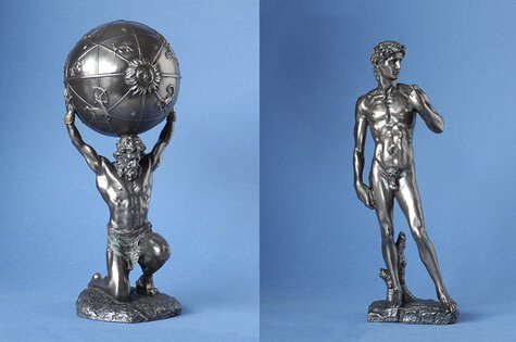 Atlas « de drager », is een figuur uit de Griekse mythologie. Atlas draagt volgens de legende als straf het hemelgewelf op zijn schouders en wordt in verband gebracht met het Atlasgebergte. De David van Michelangelo (1475 – 1564) is een van de bekendste beeldhouwwerken in de kunstgeschiedenis. Nieuw in de collectie bronskleurige figuren! (WU77302 Atlas – h. 21 cm. & WU77357 David – h. 19 cm.)