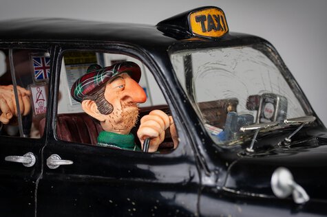 De lucht boven Londen was bewolkt. Het begon te druppelen in Kensington. Tien minuten later was het beetje regen overgegaan in een flinke stortbui. Toen de bestuurder van de Londense taxi Georges, Margaret en hun hond Dickens op het laatste moment zag, probeerde hij te remmen, maar met een van zijn wielen reed hij in een enorme kuil vol water waardoor ze compleet doorweekt werden. "Kan ik u tot dienst zijn?" vroeg de taxichauffeur. (FO85089 – h. 14 cm.)