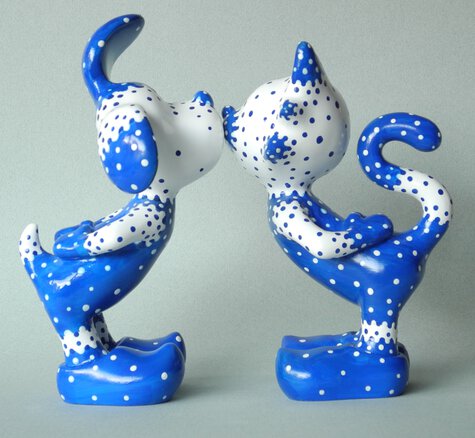 Op klompjes met blauw/wit gestippeld design, hond Lot en kat Mina, vernoemd naar de opa en oma van Jacky Zegers. Voor Jacky staan deze figuurtjes voor vanzelfsprekende liefde. Samen als set of los verkrijgbaar. (JZ61 hond Lot – h. 20,5 cm., JZ60 kat Mina – h. 19 cm.)