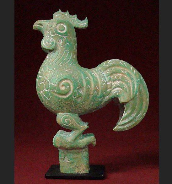 De Shang dynastie (1750-122 v. Chr. wordt beschouwd als de oudste Chinese dynastie. Hoewel er nog geen centraal geregeerd rijk was, was in deze periode wel voor het eerst sprake van een samenhangende cultuur in een groter gebied. De bronzen voorwerpen werden ten tijde van de Shang dynastie nog niet volgens de later gebruikelijke verloren-was methode gegoten. Er werd toen nog van klei rond een kern een ruime schil gevormd, om vervolgens in de open ruimte tussen de kern en schil het brons te gieten. In 1989 zijn in Saxingdui in de provincie Sichuan, ver verwijderd van het machtscentrum van de Shang-dynastie, een groot aantal bronzen rituele kunstvoorwerpen opgegraven. Ze hadden een unieke stijl, en zijn Shu-bronzen genoemd. Van de aangetroffen dierfiguren deden de meeste oorspronkelijk dienst als geornamenteerde handvatten van rituele vaten. De vogel was een favoriet onderwerp, m.n. de mythische feniks (Luan Feng), die symbool stond voor de wind.