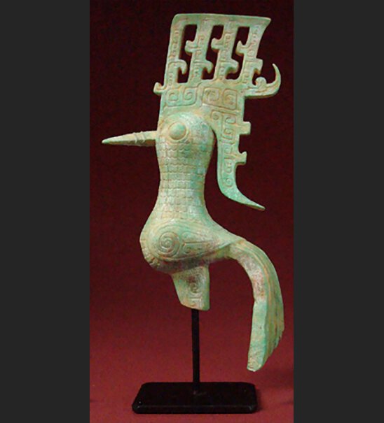 De Shang dynastie (1750-122 v. Chr. wordt beschouwd als de oudste Chinese dynastie. Hoewel er nog geen centraal geregeerd rijk was, was in deze periode wel voor het eerst sprake van een samenhangende cultuur in een groter gebied. De bronzen voorwerpen werden ten tijde van de Shang dynastie nog niet volgens de later gebruikelijke verloren-was methode gegoten. Er werd toen nog van klei rond een kern een ruime schil gevormd, om vervolgens in de open ruimte tussen de kern en schil het brons te gieten. In 1989 zijn in Saxingdui in de provincie Sichuan, ver verwijderd van het machtscentrum van de Shang-dynastie, een groot aantal bronzen rituele kunstvoorwerpen opgegraven. Ze hadden een unieke stijl, en zijn Shu-bronzen genoemd. Van de aangetroffen dierfiguren deden de meeste oorspronkelijk dienst als geornamenteerde handvatten van rituele vaten. De vogel was een favoriet onderwerp, m.n. de mythische feniks (Luan Feng), die symbool stond voor de wind.