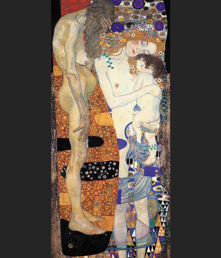 Dit zowel inhoudelijk als in kleur en ornament contrastrijke schilderij toont onze herkomst en toekomst. Centraal staat de vrouw, prachtig gestileerd als een wereldse madonna, gevangen in de onvermijdelijke kringloop van het leven, maar zonder zich daarvan bewust te zijn.