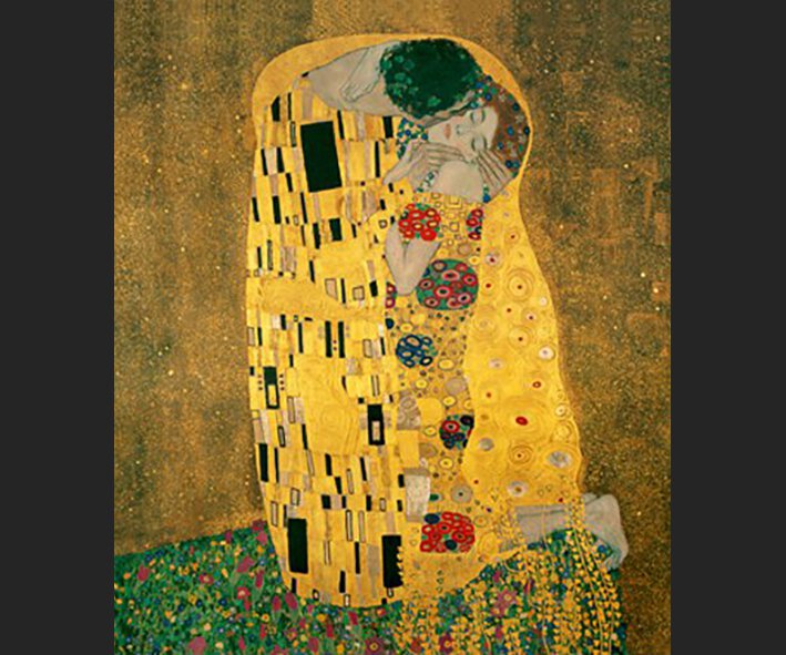 Achter de ornamentele façade gaat het zuivere, haast esoterische geluk schuil, op klassieke wijze gebed in een zee van bloemen. De geliefden lijken op een voor de Jugendstil typerende wijze los te staan van deze wereld. Een indruk die nog versterkt wordt door het gebruik van goud-tinten en bladgoud.
