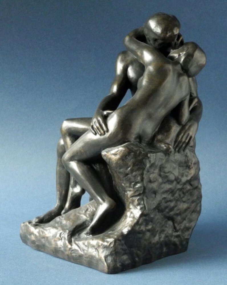 Evenals De Denker is ook De Kus ontleend aan de Hellepoort, Rodins opus magnus. Het is van oorsprong gebaseerd op de figuren Paolo en Francesca uit Dantes Inferno, die voor eeuwig tot de hel veroordeeld zijn omdat zij elkaar kusten nadat Francesca met Paolo’s broer getrouwd was. Het uiteindelijke beeld van De Kus geeft een andere indruk, niet een van wanhoop maar van geluk en ongedwongen liefde. Het beeld is zeer sensueel maar straalt een zekere liefelijkheid uit. De kus werd in 1893 ingestuurd door de Franse overheid voor deelname aan de tentoonstelling de World Columbian Fair in Chicago, maar de Amerikaanse autoriteiten vonden het beeld te gewaagd voor een publieke vertoning. Het werd opgesteld in een privévertrek dat alleen met speciale toestemming toegankelijk was. Wellicht door de geheimzinnige sfeer, was de vertoning een groot succes en is De Kus tot op heden een van Rodin’s populairste werken gebleven.