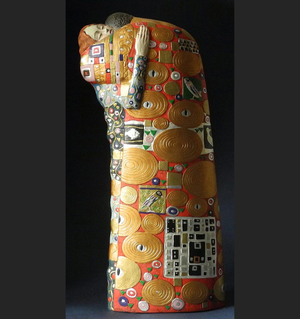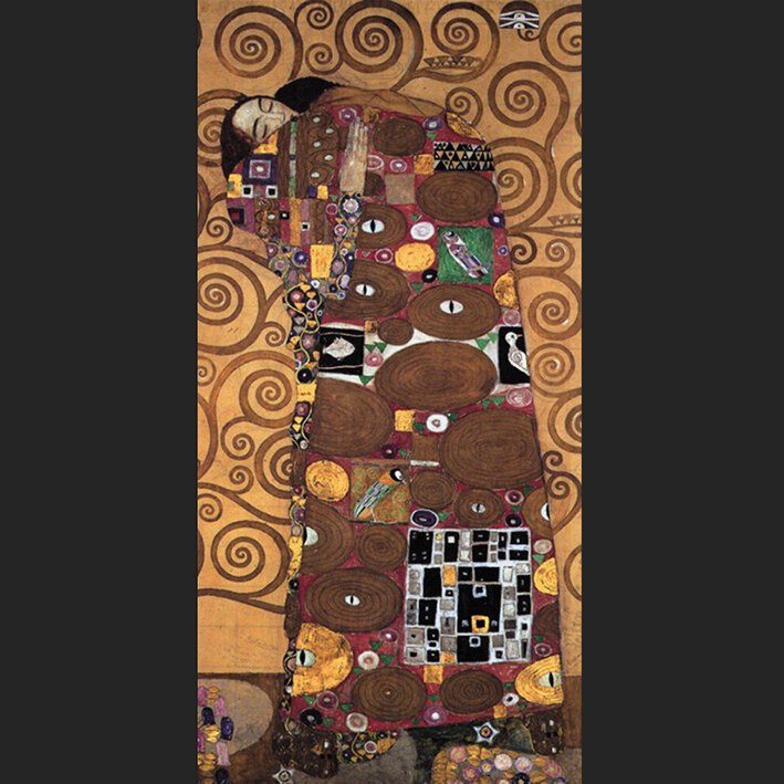 Het liefdespaar keert de wereld de rug toe, zich in een verstarde omhelzing verschuilend achter een weldaad van Jugendstil-ornamentiek. Dit is een onderdeel van het decoratieve ontwerp voor een mozaïek op de fries va de eetzaal van het Palais Stoclet te Brussel.