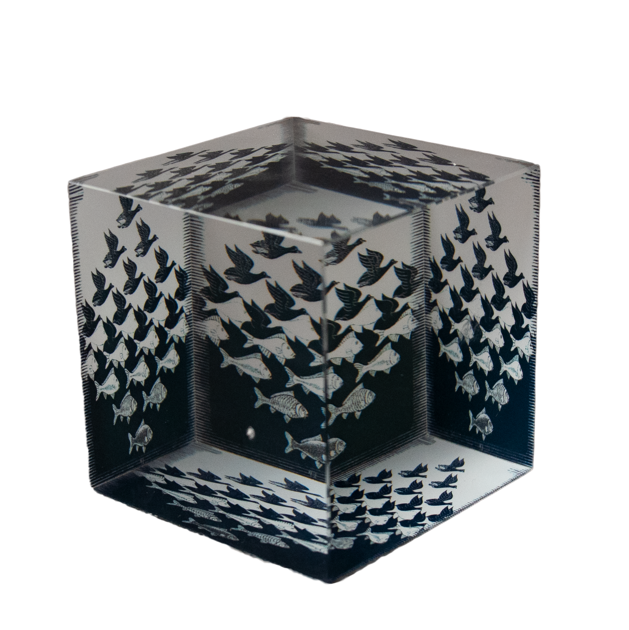 Breng een stukje verbluffende, wiskundig geïnspireerde kunst in huis met deze prachtige Air and Water paperweight uit onze QB-Art lijn. Het iconische meesterwerk van M.C. Escher komt tot leven in een fascinerend caleidoscopisch effect dat speelt met vorm, lijn en diepte.