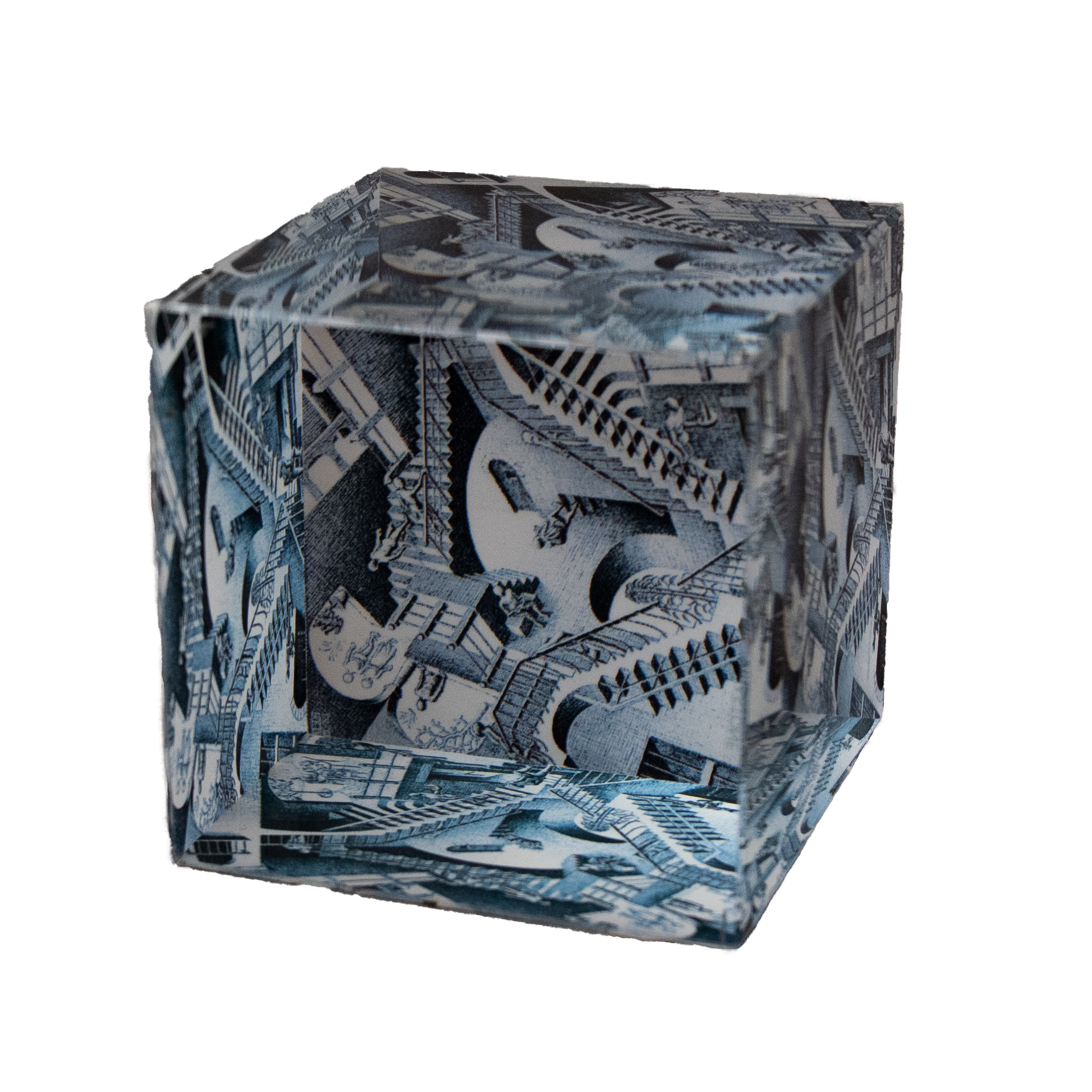 Breng een stukje verbluffende, wiskundig geïnspireerde kunst in huis met deze prachtige Relativity paperweight uit onze QB-Art lijn. Het iconische meesterwerk van M.C. Escher komt tot leven in een fascinerend caleidoscopisch effect dat speelt met perspectief, lijnen en diepte.