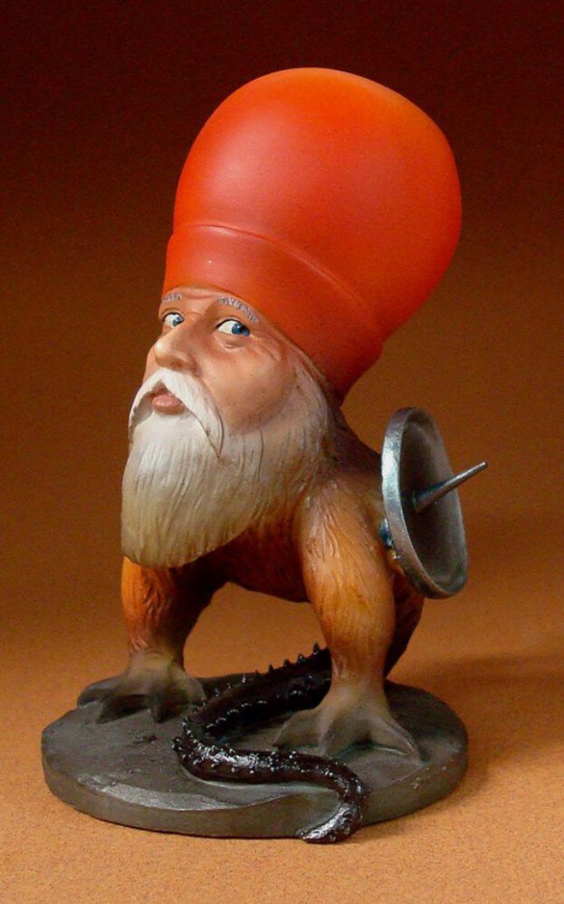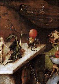 Op het middenpaneel beziet een bebaarde “rillo”, een gedrocht met louter hoofd en benen. Hij beziet met angstige blik de vleesmolen, waar zondaars op de Dag des Oordeels door worden gedraaid.