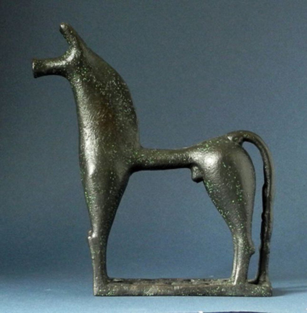 Rond 900 voor Chr. deed zich een stijlbreuk voor in de Oudgriekse kunst. Zowel in decoraties als in de beeldhouwkunst ontstonden geometrische patronen, die in niets deden denken aan de tot dan toe gebruikelijke pre-Helleense stijl. Schilders begonnen het aardewerk te decoreren met de gestileerde, ingetekende silhouetten, een stijl die al snel door beeldhouwers werd overgenomen. Het paard leende zich bij uitstek als onderwerp voor deze innovatieve, geometrische simplificatie. Iedere bronsgieterij op het Griekse vasteland ontwikkelde zijn eigen variatie, maar kenmerkend bleven de “varkenssnuit”, de gespitste oren en de driehoekige uitsparingen in de voet van het beeldje. Soms dienden de paardjes als ornament op vazen, maar meestal waren het op zichzelf staande sculpturen, die veelal als grafbeeldje werden gebruikt.