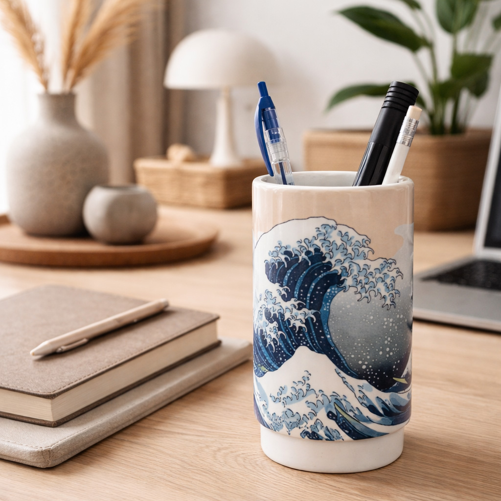 Deze stijlvolle pennenhouder biedt een vaste plek voor al je pennen, potloden en markers. Geniet elke dag van een van de beroemdste meesterwerken uit de Japanse kunst.