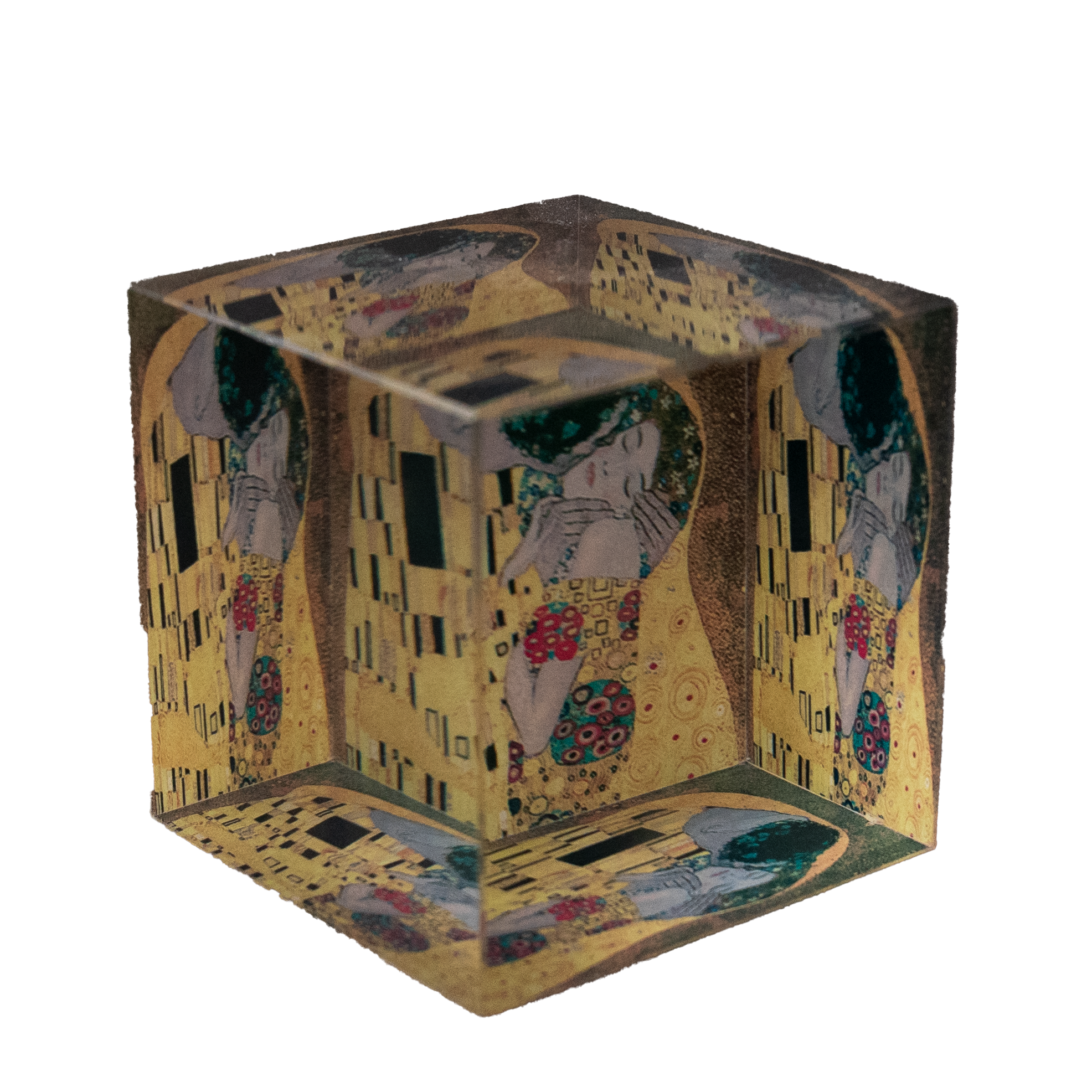 Breng een stukje weelderige, symbolistische kunst in huis met deze prachtige The Kiss paperweight uit onze QB-Art lijn. Het iconische meesterwerk van Gustav Klimt komt tot leven in een fascinerend caleidoscopisch effect dat speelt met kleur, licht en diepte.