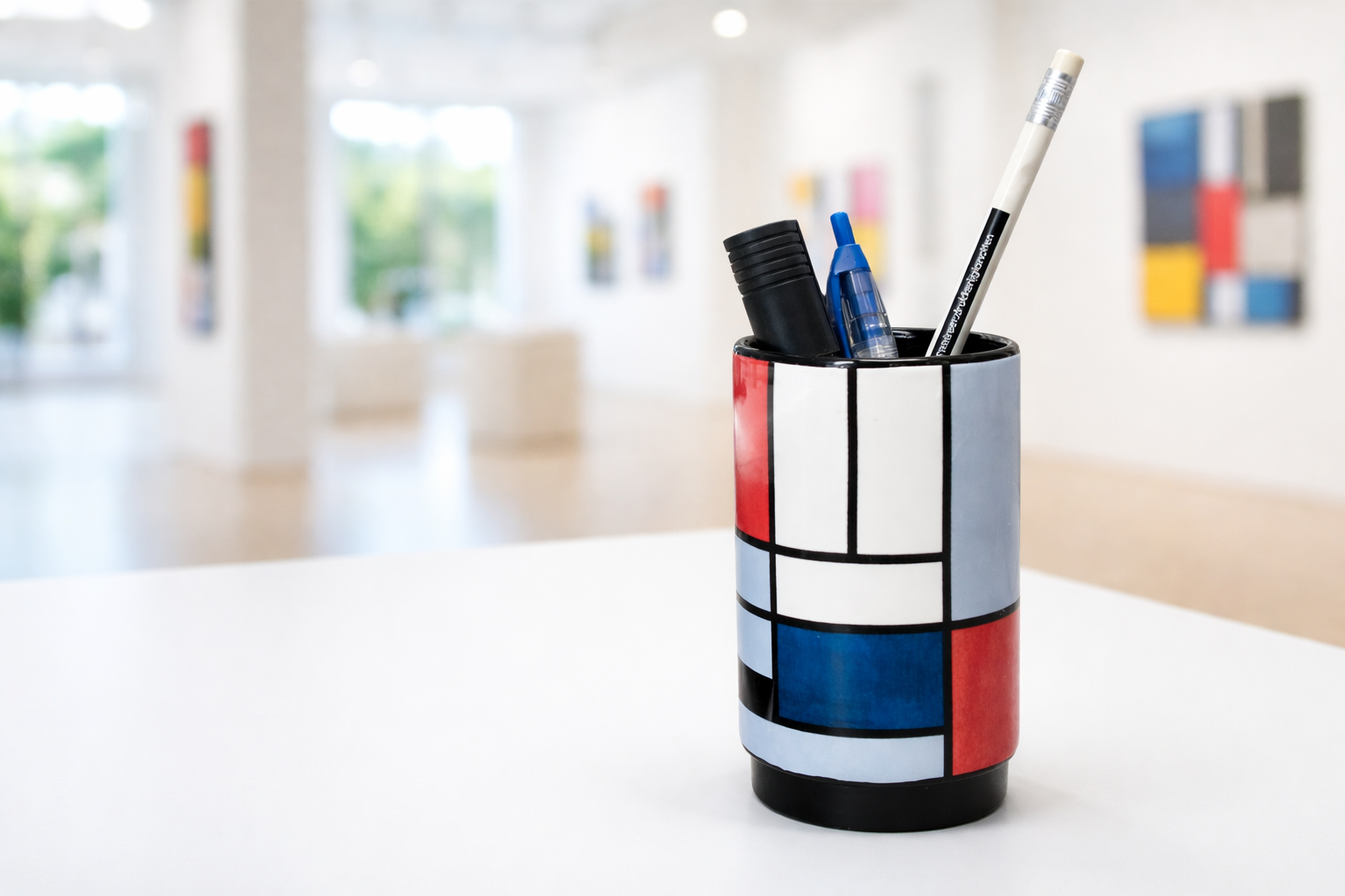 Breng abstractie naar je bureau met onze pennenhouder, met daarop Compositie met groot rood vlak, geel, zwart, grijs en blauw (1921) van Piet Mondriaan. Deze compositie is een van de belangrijkste werken van wat Mondriaan het neoplasticisme noemde. In 1920 publiceerde hij Le Néo-plasticisme, waarin hij zijn ideeën theoretisch onderbouwde en voortbouwde op eerdere publicaties in De Stijl over zijn ‘nieuwe beelding’. Het werk toont nog relatief veel gekleurde vlakken, voordat Mondriaan in latere jaren zijn zoektocht naar het juiste ritme en perfecte balans voortzette. Functioneel en stijlvol, biedt deze pennenhouder de ideale plek voor al je pennen, potloden en markers, terwijl je dagelijks geniet van een meesterwerk van moderne kunst.