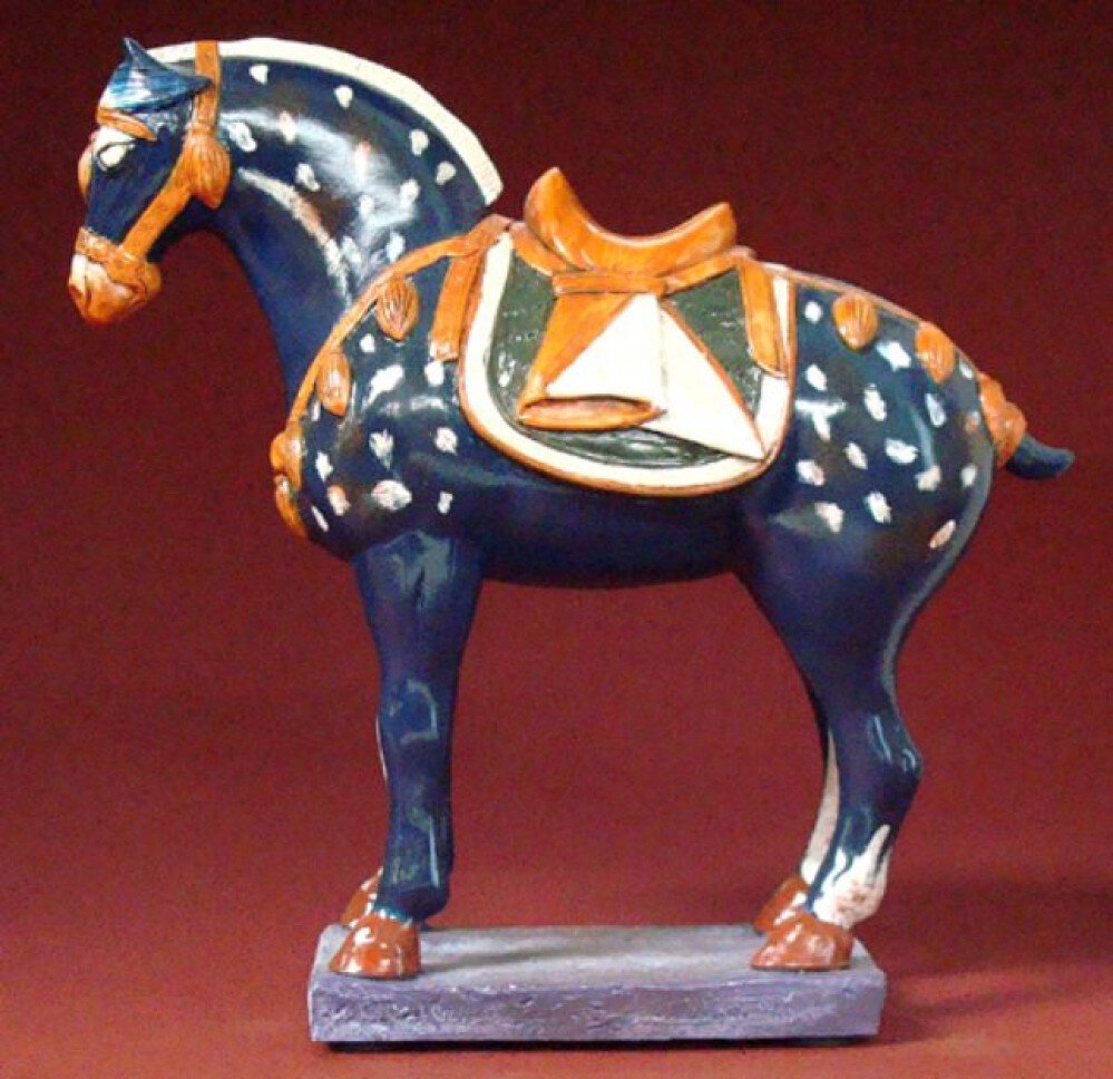 Tijdens de Tang dynastie (618-907) bereikte de Chinese keramische traditie een artistiek hoogtepunt. Op basis van het bruin en groen geglazuurde aardewerk uit de Han dynastie ontstond het befaamde driekleurige aardewerk, het Tang Sancai. Verreweg het meeste van het driekleurige aardewerk werd geproduceerd als grafgift (minqi). Rond Changan en Luonyang waren daarvoor grote werkplaatsen ingericht. In de graven van hooggeplaatste personen werd aardewerk in alle maten en soorten bijgezet. Zo waren er beelden om het graf te bewaken, beelden om de goden gunstig te stemmen en voorwerpen en beelden om ervoor te zorgen dat het de overledene in heet hiernamaals aan niets zou ontbreken. Het paard gold als het meest favoriete dierfiguur. Geproduceerd in mallen werd het soms in grote getalen bijgezet.
