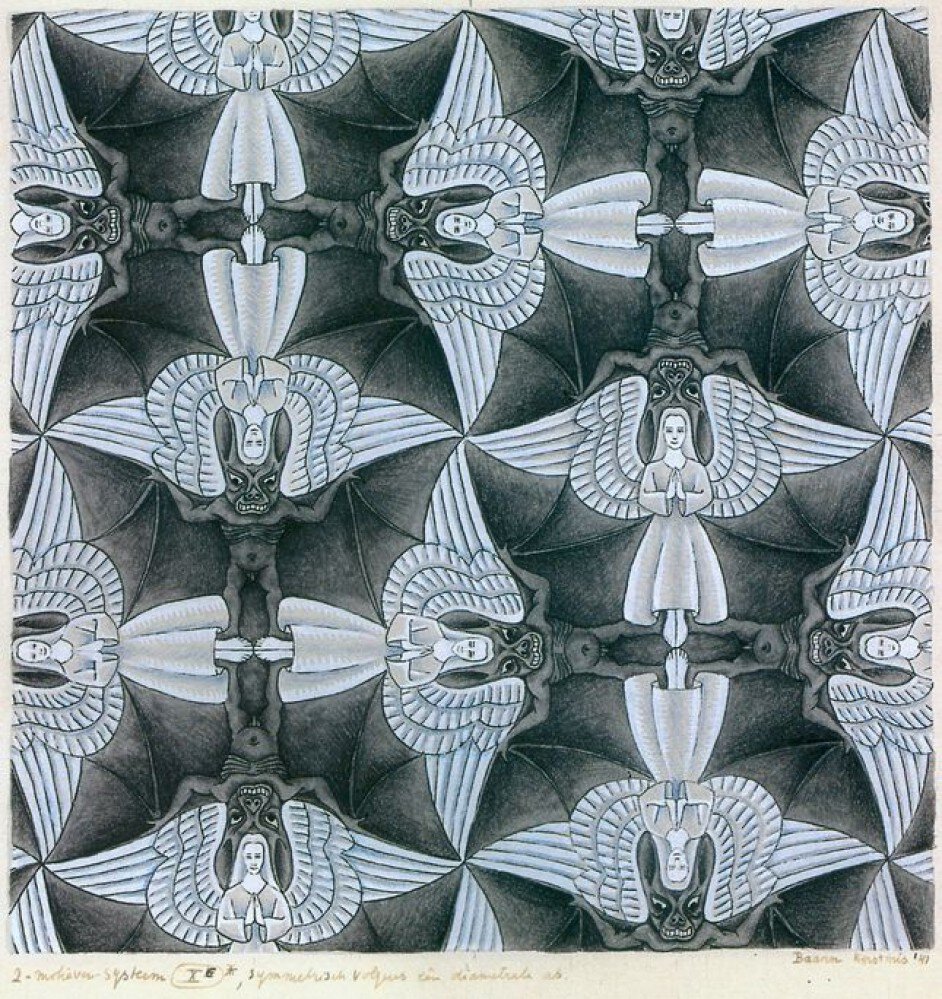 Escher was fascinated by Japanese woodcarving, which he admired greatly, and during the war years he transposed a number on to wooden spheres.  As the sphere has no limitations, this shape was perfect for his ‘infinitive’ systems.