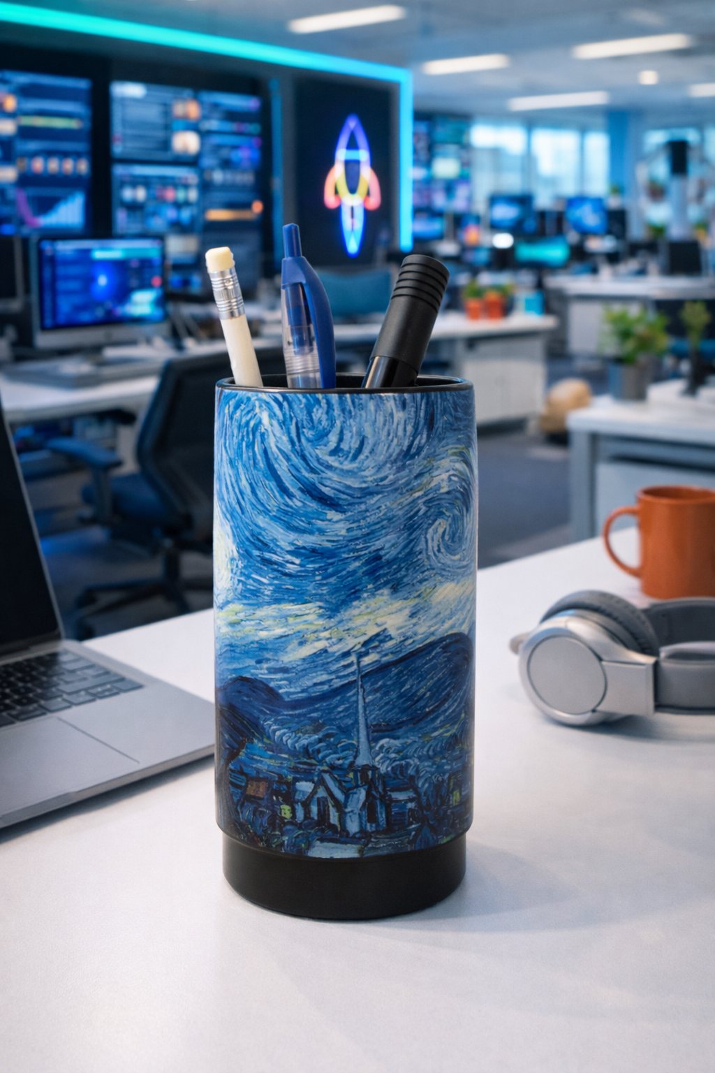 Deze stijlvolle en functionele pennenhouder biedt niet alleen een perfecte plek voor al je pennen, potloden en markers, maar brengt ook dagelijks inspiratie op je werkplek. Een stukje iconische Van Gogh-magie binnen handbereik.