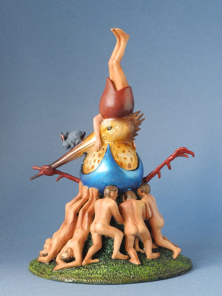 De door mannen getorste vogel in het blauwe ei, links op het paneel, heeft kenmerken van de hop. Deze gekuifde vogel stond voor onreinheid omdat hij zijn nest niet schoon hield. Daarnaast symboliseerde hij in de middeleeuwen het hoerenlopen.