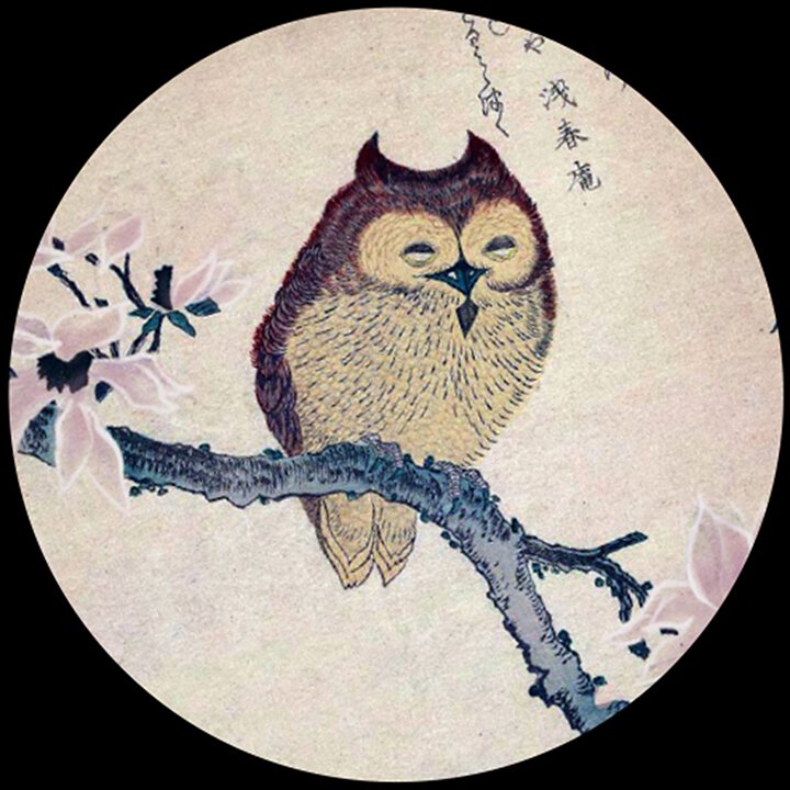 De uil is in Japan een zeer populaire vogel, die symbool staat voor geluk en bescherming tegen het lijden. Op deze prent zit de uil op een tak van de magnolia, die in de Hanakotoba, de Taal der Bloemen, “Liefde voor de natuur” heet.